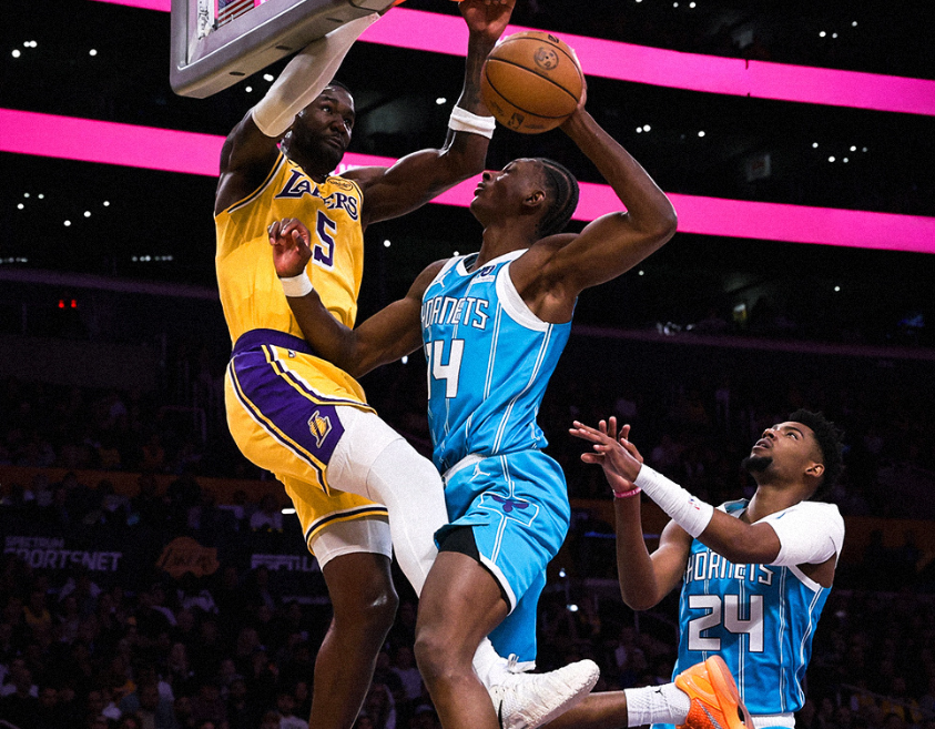 节末黄蜂替补又追分,第一节湖人39-30领先。进入第二节,三球鲍尔联合米勒不断蚕食分差,湖人篮板球丢得有点多,内线防守形同虚设。中段黄蜂的塞恩詹姆斯和米勒下三分雨,布里奇斯冲击篮下,迪亚巴特轻松吃饼,湖人攻防崩盘。后半段艾顿吃饼暴扣+詹姆斯正面干拔三分球稍稍止血,克尼佩尔再中压哨三分,半场湖人55-64落后黄蜂。进入下半场,老詹再中三分,但三球鲍尔下起三分雨回应,和布里奇斯携手拉开最多15分分差!艾顿连续强攻得手,鲍尔超远三分球太准了!中段东契奇开始强攻,一路追到只差4分。